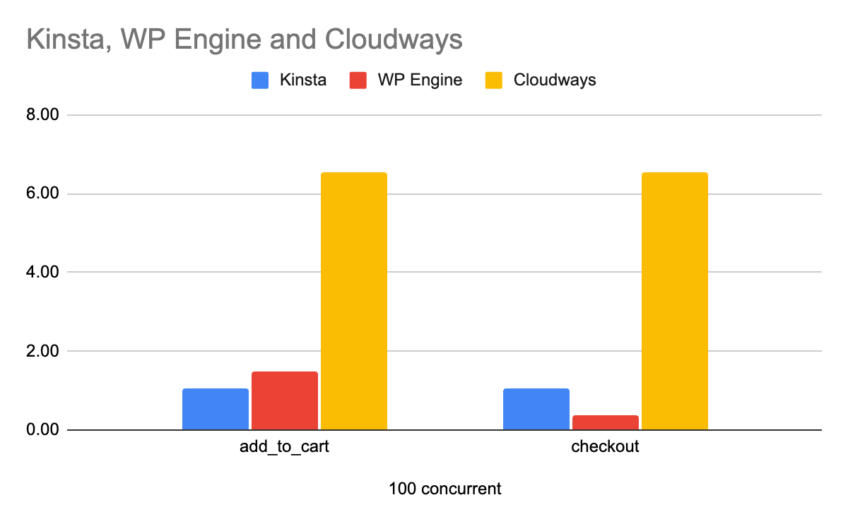 With 100 concurrent users Kinsta managed to handle 1.07 and 1.04 add to carts and checkouts per second respectively, an increase from the previous concurrency, but with a continued downtrend on the response time, with an average of 11.13 seconds. The total requests handled was 11304, resulting in 7.39 RPS for the duration of the test.