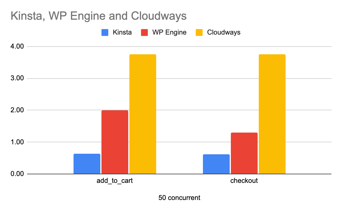Cloudways did significantly better than both WP Engine and Kinsta in this 50 concurrency test with 3.76 add to carts and checkouts per second, with an impressive 0.702 second average response time and 39781 total requests, clocking in at an average of 26 requets per second with no failures.