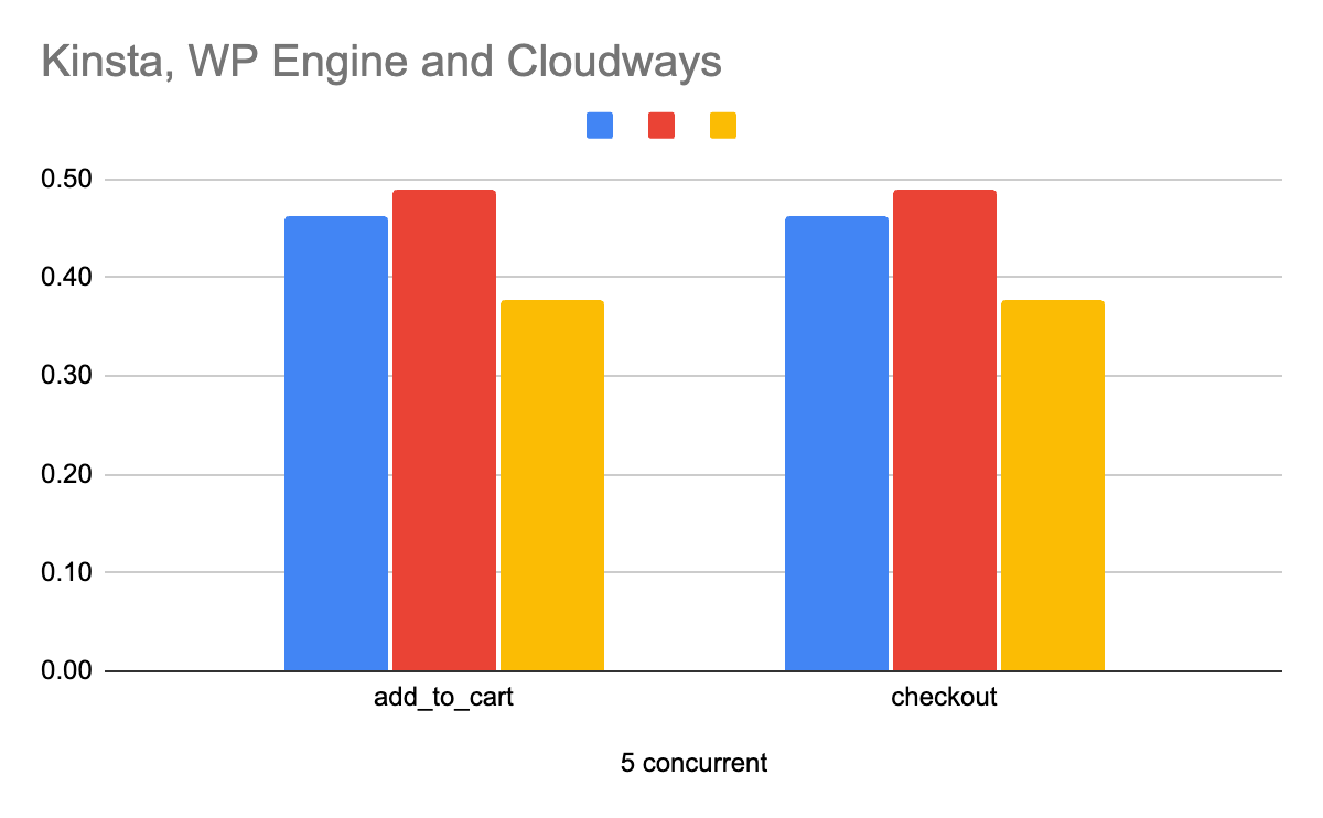 Kinsta: at low concurrency (5 users) we saw a stable 0.46 add to carts and checkouts per second with Kinsta with a stable average response time of 0.382 seconds. The entire test took 4886 requests with an average of 3.24 requests per second for the duration of the test (25 minutes and 30 seconds).